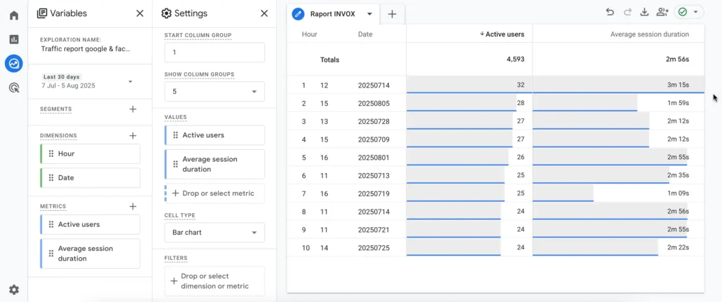 To find out the maximum number of users per hour and the average session duration, please follow the steps below.